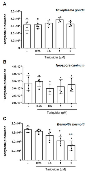 Tariquidar treatment differentially affects T. gondii, N. caninum and B. besnoiti tachyzoite production. The hosts cells pre-treated with tariquidar (0.25, 0.5 and 2 µM) were infected with T. gondii (A), N. caninum (B) or B. besnoiti (C) tachyzoites in inhibitor-free medium for 4 h, followed by the compound re-administration. At 48 h after infection, the number of tachyzoites present in cell culture supernatants were counted. Bars represent means of five biological replicates ± standard deviation.