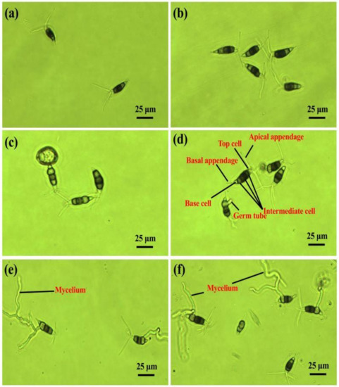 As shown in Figure 2, the conidia of P. microspora and P. versicolor are similar in size, with the width of 4.53–6.65 μm and the length of 18.36–27.88 μm. The length of the top attachment ranged from 9.25 to 26.56 μm, the length of the base attachment ranged from 2.60 to 8.12 μm, and the length of intermediate cells ranged from 11.67 to 17.67 μm. The intermediate cells of conidia of P. microspore strain YS26 are monochromatic and almost the same color, light brown. The color of the middle cell is the darkest, and the bottom cell’s color is the lightest. The top and base cells are transparent and colorless, and the shape is fusiform or spindle. There are 2–4 appendages attached to the top (mostly is 3), and one attachment to the base. Furthermore, the germination rate of conidia was similar between glass slides and hard plastic (Figure 2). The conidia began to germinate on both glass slide and hard plastic after 10 h of incubation. It was found that the basal cell of the conidia of P. microspore strain YS26 expanded first, and the germ tube grew from the vertical direction of the basal cell or the side of the penultimate cell of the base, which was different from the conidia germination of P. versicolor strain XJ27 (Figure 1 and Figure 2).