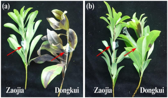 Although some studies have found that the application of chemical fungicides such as difenoconazole, prochloraz, iprodione, pyrazoxystrobin and propiconazole can have a certain effect on the control of bayberry twig blight disease, the disadvantage of environmental pollution is also obvious [14,15]. Biological control of P. versicolor is still limited to the laboratory and has not been widely used in orchards [16,17]. In order to effectively control this disease, an alternate method is to popularize and cultivate resistant varieties. At present, compared with the highly susceptible cultivar Dongkui, Zaojia is the main variety of bayberry with high resistance to twig blight in the market. This resistance may be mainly due to its characteristics of dwarf trees and short fruit maturity [18]. However, up to now, there is no systematic study on the difference in the infection process between resistant and susceptible varieties of bayberry [6].