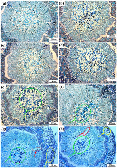 Microscopic observation on the longitudinal section of bayberry resistant (a,c,e,g) and susceptible (b,d,f,h) cultivars after 0, 6, 48 and 72 h of pathogen infection. The red circle represents phloem and xylem, while the green circle represents medulla.