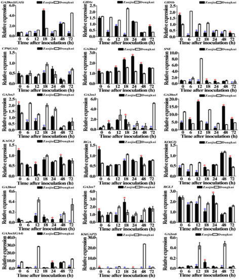 Relative expression of gibberellin signaling pathway-related genes in stems of resistant (Zaojia) and susceptible (Dongkui) bayberry cultivars following the infection of twig blight pathogen. Data were analyzed by one-way analysis of variance (ANOVA) with least significant difference (LSD) posthoc test. These values are the mean of three repetitions ± standard error of the means. The asterisk (*) in red and blue over bars represent the significant (p < 0.05) upregulation and downregulation, respectively, in the expression of one gene in resistant cultivar relative to the susceptible cultivar. MrUBQ1 was used as the internal reference gene.
