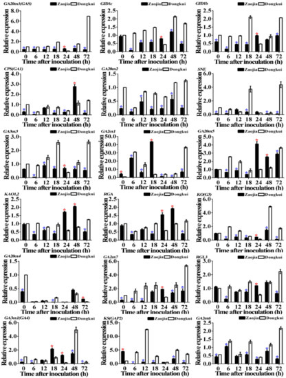 However, at 72 h after pathogen inoculation, there was a significant (p < 0.05) change in expression of 11 genes in leaves between resistant and susceptible bayberry cultivars, while no significant difference was observed in the expression of other seven genes between resistant and susceptible bayberry cultivars. Indeed, the relative expression of four genes (GID1c, GID1b, GA20ox5 and KO(G3)) in resistant cultivars is 2.24-, 1.24-, 1.50- and 2.02-fold, respectively, higher than that of susceptible cultivars, the relative expression of seven genes (GA20ox1(GAS), CPS(GA1), SNE, GA2ox1, GA20ox4, GA3ox1(GA4) and KS(GAP2)) in susceptible cultivars is 7.95-,1.61-, 7.44-, 20.64-, 35.00-, 6.18- and 2.50-fold, respectively, higher than that of resistant cultivars (Figure 7).