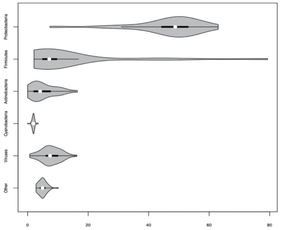 Violin plot (box plots with rotated kernel density plots added on each side) presenting the percentage of classified short reads assigned to different phyla in 50 human corneas based on the RNA-Seq data.