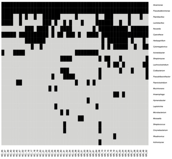 Heatmap showing presence (black) or absence (light gray) of different prokaryotic and viral genera in 50 human corneas based on the RNA-Seq data. Presence of a genus is defined by the threshold value of 1% of classified reads assigned to it.