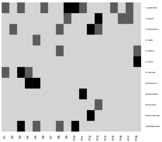 Heatmap showing presence and absence of different bacterial species/genera in 18 patients established using traditional microbiology techniques. Black and dark-gray colors are used to designate presence of a given taxon in both eyes and one eye respectively, while light-gray color indicates taxon absence. Negative fungal results are not presented.