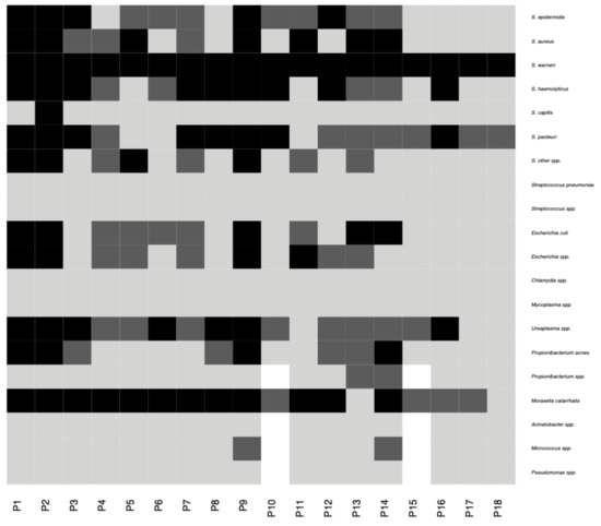 Heatmap showing presence and absence of different bacterial species/genera in 18 patients established using PCR methods. Black and dark-gray colors are used to designate presence of a given taxon in both eyes and one eye, respectively, while light-gray color indicates taxon absence. Missing values are colored white. Negative fungal results are not included.