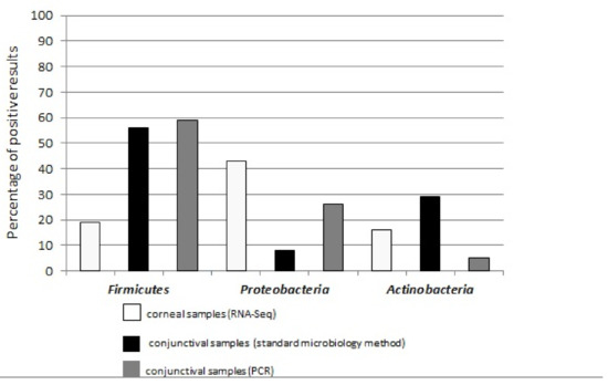 Proteobacteria was a dominant phylum in most of the corneal samples, while another phylum, Firmicutes, was detected in the vast majority of conjunctival samples. Only two genera, Paenibacillus (25–63%) and Lactobacillus (10–14%), belonging to Firmicutes, seem to be dominant in the microbiome of the seven corneal samples. However, these two were not detected in conjunctival swabs. While Staphylococcus spp. was predominant in conjunctival samples (56% in PCR), it constituted only 0.1% of reads (RNA-Seq) in corneal tissues. Tenericutes was a bacterial taxon only detected in the conjunctiva (10% of examined samples in PCR). In corneal tissues, we found fastidious microorganisms such as Actinomycetales, anaerobic bacteria, and viruses.