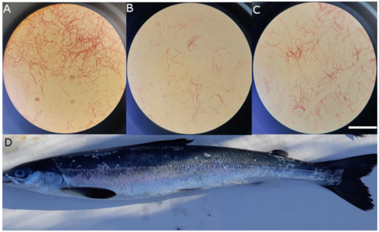Gram stains of Tenacibaculum finnmarkense AY7486TD isolates (LI C6 FM3-M [A, LI C6 FM3-G [B, and LI C6 FM3-F [C]) collected from an Atlantic salmon (D, fork length = 32 cm) at the Larson Island netpen site on 1/28/2020 during a tenacibaculosis outbreak. Isolates were identified based on morphology, qPCR results and the 16S rDNA sequence of LI C6 FM3-F. Numerous dislodged scales on the body, areas of discolouration and yellow plaques on the jaws were present. Gram-negative and filamentous bacteria were grown on FMM agar with kanamycin and viewed at ×1000 magnification. The white scale bar (32 µm) applies to (A–C).