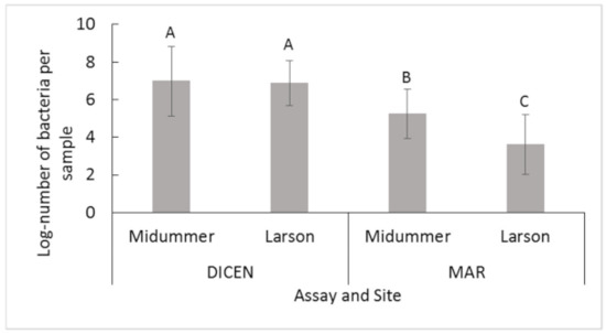 Mean +/− SD. Log-number of bacteria for positive samples for the T. dicentrarchi (DICEN) and T. martimum (MAR) specific qPCR assays at the Midsummer and Larson Island netpen sites. Different letters indicate significant differences (p ≤ 0.05).