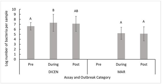 Mean +/− SD. Log-number of bacteria for positive samples from the Midsummer site based on outbreak category using the T.dicentrarchi (DICEN) or T. maritimum (MAR) specific qPCR assays. Significant differences (p ≤ 0.05) are identified using different letters, uppercase and lowercase letters indicate separate Welch′s ANOVAs.