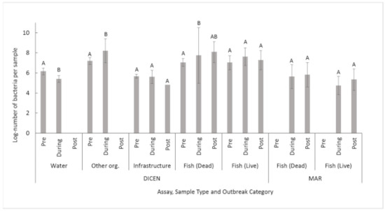 After the outbreaks at MS and LI, bacterial numbers decreased or were not detected, except no significant decreases occurred for infrastructure swabs, live fish samples and dead fish samples. Both results support the likelihood for a recrudescence of tenacibaculosis, as has been noted clinically.