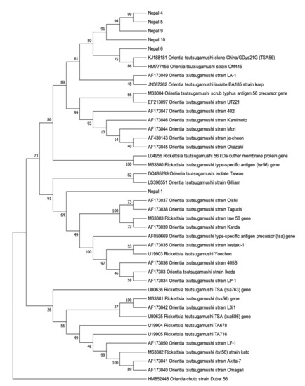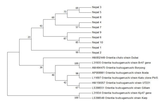 Amplicon sequencing of the 56 kDa and 47 kDa PCR products was performed at Macrogen (Seoul, Korea). Sequences obtained were compared with sequences available by BlastN analysis (http://blast.ncbi.nlm.nih.gov accessed on 15 February 2021). The relationship of the Nepalese phylogenetic analysis was performed by the construction of the phylogenetic trees using the amplified 56 kDa and 47 kDa partial gene sequences separately. A phylogenetic tree was constructed from O. tsutsugamushi strains obtained from Genbank using the neighbor-joining method [24], as presented in MEGA 7 [25].