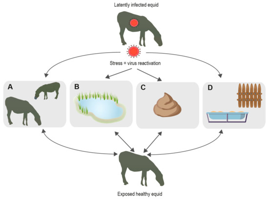 Known and possible EHV transmission pathways. When hosts are under stress, EHV is likely to become reactivated enabling hosts to shed virus and spread via different pathways; (A) transmission through direct contact with other animals; (B) indirect transmission through water; (C) indirect transmission via fecal matter; (D) indirect transmission by fomites.