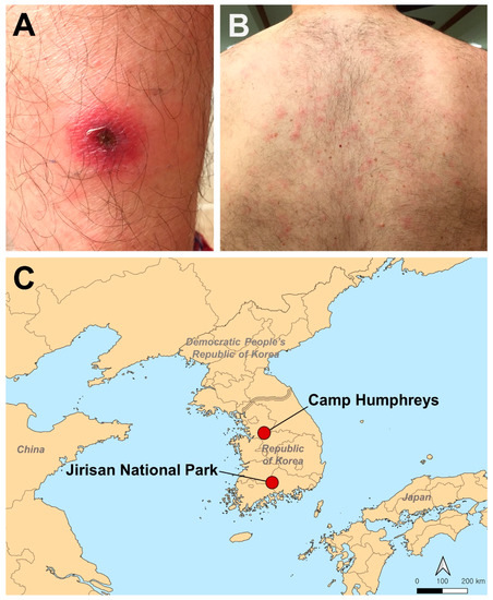 On 26 November, the patient was interviewed by Force Health Protection and Preventive Medicine, 65th Medical Brigade, and a biopsy of the eschar was obtained with the patient’s verbal approval. The eschar tissue was placed in a −80 °C freezer and transported to Korea University the following day. The patient provided photos of the rash and eschar, as well as area information of the military base where he worked and Jirisan National Park that he visited (Figure 1C). On 28 November, the fever had subsided, and the patient was discharged from the hospital.