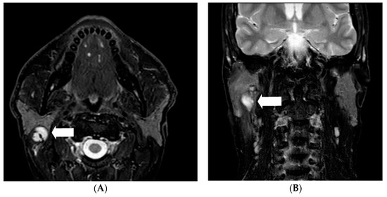 MRI of head and neck, 1.5 tesla magnet. T2 fatsat imaging in axial (A) and coronal (B) orientation. Cystic lobulated tumor in the medial lobe of parotid gland adjacent to the facial nerve (arrow).