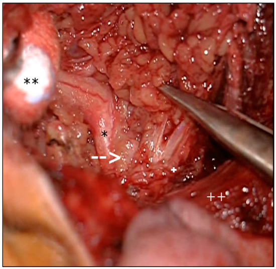 Imaging during surgery reveals a cystic tumor surrounding the parotid gland (facial nerve (*); rami zygomaticus and frontalis (**); cystic tumor (arrow); ramus marginalis mandibulae (+); sternocleidomastoid muscle (++)).