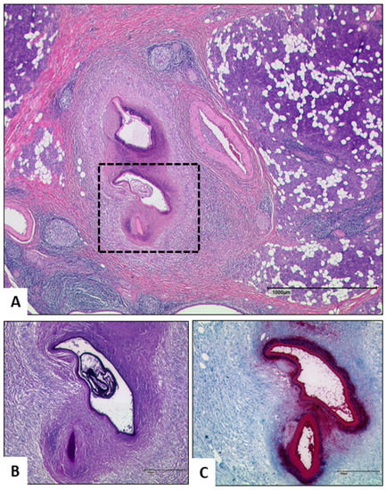 (A,B) Histology of the parotic gland shows a pseudocystic lesion with strong chronic and necrotic inflammation in the parenchym with induction of fibrosis. Immunohistochemical staining with the monoclonal antibody Em2G11 (C) revealed a slender structure as residuum of the larval stage of E. multilocularis.