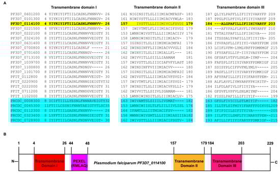 Protein sequence alignments of the PfMC-2TM orthologues are shown in yellow and blue highlighted areas of Figure 1A. The sequence shows an overall 79% similarity among the sequences from P. falciparum strains 3D7 and IT and sequences from P. reichenowi (PlasmoDB & OrthoMCL). Twelve of the 13 PfMC-2TM multifamily proteins were predicted to possess three transmembrane domains with the signal peptide overlapping the first transmembrane domain at the N-terminus of the proteins from P. falciparum. In silico analysis from PlasmoDB (http://plasmodb.org, accessed on 15 February 2021), shows that the predicted protein PfMC-2TM expressed by PF3D7_0114100 has a length of 229 amino acids (aa) and contains 3 transmembrane domains (Figure 1B). The predicted position of the signal peptide (SP) spans amino acid position 1 to 12, transmembrane domain 1 (TM1), spans amino acid position 4 to 26, transmembrane domain 2 (TM2) from position 157 to 179 and transmembrane domain 3 (TM3) from position 184 to 203 (Figure 1B). Domains were evaluated using PlasmoDB and HMMTOP analysis. These TM domains are represented as hydrophobic residues, with the remaining portions of the protein as polar. The predictions of hydropathy plot and secondary structure of the sequence suggests the protein possesses three helical structures at individual TM domain regions (PlasmoDB). Two of the three transmembrane domains in PfMC-2TM; from position 157 to 179 and 184 to 203 have been identified to be associated with the PVM and MC membrane previously [24]. The originally annotated N-terminus of PfMC-2TM was shown to have a signal peptide (SP) overlapping with TM1 but it was not cleaved upon protein translocation [24,30]. The topology of TM1 domain at the N-terminus spanning amino acids 4 to 26 and its association with the MC is unknown. PfMC2TM is an integral membrane protein that possesses a PEXEL motif. Secondary structure analysis of the protein shows that the protein possesses four helices with two helices predicted at the N terminus and two at the C terminus of the protein (PlasmoDB).