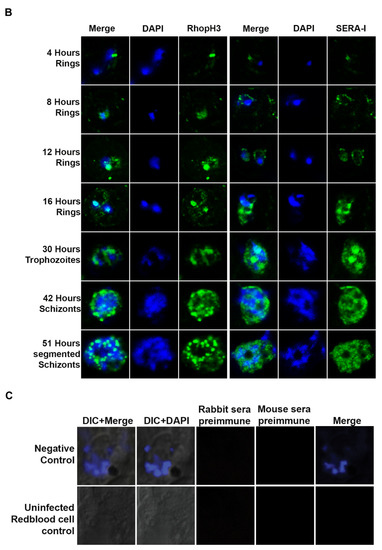 Protein expression in 4hpi rings was detected colocalized with REX-1 specific antibody. In order to validate endogenous protein expression for the blood stage, expression levels of SERA1 and RhopH3 proteins, used as controls to verify parasite stages and expression of known proteins [31], were also analyzed at each time point to ensure the integrity of stage specific protein expression (Figure 2B). SERA1 and RhopH3 proteins used as positive controls for stage specific expression showed protein expression at each parasite stage as reported previously [31,32].
