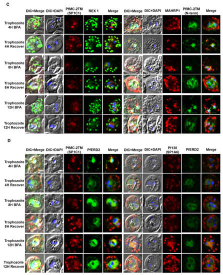 PfMC-2TM remains sensitive to Brefeldin-A during the trophozoite stage of Plasmodium falciparum 3D7 strain. Twenty hours old, early trophozoites were treated with BFA for 12 h and timepoints were collected at 4, 8 and 12 h, respectively. The cells after respective timepoints were washed and recovered. (A). Monoclonal antibody (mAb) SP1C1 specific for PfMC-2TM, anti-SERA1 specific for the parasitophorous vacuole protein (SERA1), and anti-RhopH3 (green) were used. (B) Antibodies SP1C1 specific for PfMC-2TM and antibodies specific for the C and N termini of PfMC-2TM were used. (C) Monoclonal antibody SP1C1 (red) specific for PfMC-2TM and antibodies specific for the MC resident proteins REX1 (green). MAHRP1 (green). (D) SP1C1 and antibody SP1A6 against the MC protein Pf130 were also incubated with anti-PfERD2. Briefly, PfMC-2TM (red), SERA1 (green), RhopH3 (green), REX1 (green) and PfERD2 (green) accumulated inside the parasite in close proximity to the nucleus in Brefeldin-A treated cells. Removal of drug pressure shows translocation of PfMC-2TM into the cytoplasm and association with the MCs in the erythrocyte cytoplasm (Recover).