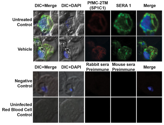 The untreated control and vehicle treated parasites were tested with α-PfMC-2TM (red) and α-REX1(Green) antibodies. The untreated and vehicle (ethanol) controls continued into the schizont stage of the parasite as multiple nuclei were visible inside the parasite and red blood cell. The parasites were viable in the vehicle treated cultures and the parasites progressed to the schizont stage. The normal rabbit serum and myeloma spent culture supernatant did not react with the parasite proteins. The antibodies α-PfMC-2TM (red) and α-REX1 (Green) did not react with the uninfected red blood cells. Negative control normal rabbit serum and normal mouse serum do not react with parasite proteins and uninfected red blood cells. Nuclei are stained with DAPI.