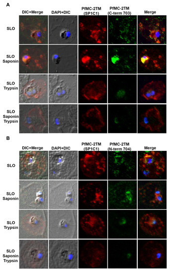 We next investigated the topology of PfMC-2TM in the erythrocyte cytoplasm following the demonstration of BFA sensitivity by PfMC2TM. Infected erythrocytes were formalin-fixed and permeabilized with streptolysin O (SLO) alone, SLO in combination with saponin with (+) or without (−) treatment with 1 mg/mL trypsin. A schematic illustration showing targets of permeabilization by SLO, Saponin and trypsin treatments is shown in Figure 6. Smears of the permeabilized cells were prepared on glass slides and IFA studies were performed to confirm the distribution, localization and protease accessibility of PfMC-2TM. The anti-N-terminus of PfMC-2TM (703), anti-C-terminus of PfMC-2TM (704) and monoclonal antibody SP1C1 [24] were used for the analysis. SLO selectively forms pores on the RBC plasma membrane, leaving PVM and MC membranes intact. Saponin disrupts the erythrocyte plasma membrane, MC membrane and PVM, but leaves parasite membrane intact (Figure 6) [35,36,37]. The parasite membrane remains intact so protein in the parasite is detected in the pellet if the protein is still associated with the parasite membrane.