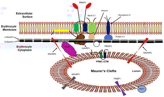 - Przyborski, J.M.; Miller, S.K.; Pfahler, J.M.; Henrich, P.P.; Rohrbach, P.; Crabb, B.S.; Lanzer, M. Trafficking of STEVOR to the Maurer’s clefts in Plasmodium falciparum-infected erythrocytes. EMBO J. 2005, 24, 2306–2317. [Google Scholar] [CrossRef] [PubMed]