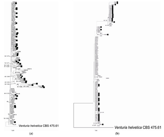The housekeeping genes used in the study, EF-1α and β-tubulin, are frequently used as molecular phylogenetic markers to deduce the evolutionary history and genetic variation of morphologically similar fungal species [32] and also reliably estimate the phylogenetic relationships within Venturia [33]. In our study, although the EF-1α gene showed the highest phylogenetic signal from the analyzed regions (the highest percentage of parsimony informative and segregating sites) and the concatenated dataset based on housekeeping genes had more phylogenetic signals that concatenated pathogenicity-related regions, it was not possible to differentiate the V. inaequalis Rvi6-virulent from -avirulent strains based on these regions in our study, which can be explained by insufficient variation in housekeeping gene sequences. Although multiple gene sequences are evolving with different substitution patterns, concatenating gene sequences into a supergene alignment may provide more accurate trees [33]; however, in our study, concatenated data did not exhibit discrimination between Rvi6-virulent and -avirulent populations. All strains used in this study, representing four pathogenic races (according to Bus et al., 2011 [2]), were examined previously by multilocus microsatellite analysis [11]. These and other reports, comprising V. inaequalis populations from European orchards, demonstrated that pathogen populations, sampled from various apple tree cultivars, are divided into two main groups, where belonging to a group is conditioned by virulence or avirulence towards the Rvi6 host gene [5,9,10,11]. Therefore, our experiment aimed to verify whether this division is also detectable in genic regions, especially those potentially related to pathogenicity. Our results indicated no correlation between the genetic features of the tested strains and their geographical origin, host cultivar or pathological race. Similarly, Zhao et al. [33] reported that intraspecific phylogenetic relationships among strains belonging to different pathological races in V. nashicola were not detected. Additionally, Gladieux et al. [7] observed that none of the single-locus genealogies showed a clear partitioning of isolates from various host plants into separate clusters; however, they observed a substantial level of differentiation among three groups: infecting loquat, pyracantha or apple, indicating that some forces act to counteract free exchanges of genetic material. In this instance, isolates from different hosts were differentiated but did not form diagnosable distinct phylogenetic groups. Moreover, many clades or subclades were resolved with low (below 50%) bootstrap values, indicating that overall sequence diversity is not high. This phenomenon may be observed when very conserved DNA fragments are used and sequences are too similar to each other; thus, the number of informative sites is too small, and variation is too low, and grouping into branches is therefore equivocal.