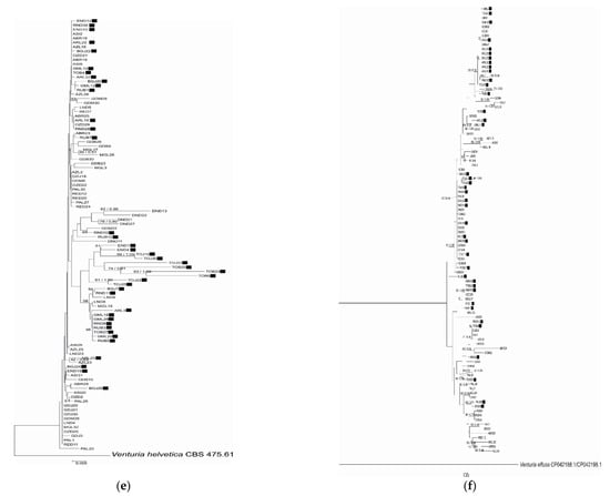 Housekeeping genes, as slowly evolving regions that encode proteins essential for microorganism survival [20], are suitable to investigate the evolutionary pathways of taxa emergence and the relations between them, e.g., for species delimitation, and to investigate genetic relatedness among strains and populations of Eukaryota taxa, including plant or human pathogenic fungi [21,22,23], while, at the same time, conserved gene markers may exhibit insufficient intraspecies genetic variation to differentiate strains [22]. Fungal effector genes are genes coding molecules involved in interactions with host plants, but are not necessary for a pathogen to complete its lifecycle in vitro, such as those encoding infection structures, CWDEs, toxins or components suppressing the plant immune response; their products can act as elicitors or virulence and avirulence factors [24,25,26]. In MLSA of the putative effector genes, it is possible to utilize patterns of nucleotide diversity to infer the molecular base of pathogen coevolution with its host plant [27]. This approach implies that regions connected to pathogenicity specialized to host cultivars are under selective pressure exerted by host resistance genes and are expected to differ between pathogenic races or types [28]. An adaptation to the new ecological niches depends mostly on the genes located on the variable regions of the genome, which can adapt more quickly than the conservative parts of the genome, thereby causing detectable differences between them. To the best of our knowledge, these regions have never been investigated in the context of phylogenetic analyses in V. inaequalis or in terms of their diversity in relation to the virulence abilities of V. inaequalis races.
