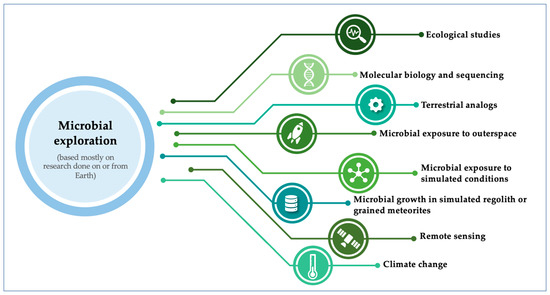 Microbial presence and movement across different layers of our atmosphere is another relevant aspect. Aerobiology has shown that microorganisms can be transferred in the air through aerosols or attached to other particles. After this discovery, studies at higher altitudes were among some of the pioneer studies in the field of exobiology and astrobiology [13]. It is now known that many microorganisms survive in our atmosphere, with reports of maintenance of viability of pathogenic strains after exposure to the stratosphere [8,13]. Microbial isolations have been successfully performed from air and dust samples from the troposphere and stratosphere [8], and many others have been made from space station such as those described in [14,15,16,17,18].