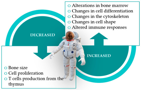Spaceflight appears to have an impact on the development of acquired immunity as it affects lymphoid organ homeostasis and the differentiation and maturation of several cells of the immune system, particularly lymphocytes [120,125]. It is worth noting that B lymphocytes, myelocytes, erythrocytes, hematopoietic stem cells and other progenitor cells are formed and mature in the bone marrow, and that bones suffer some of the most drastic changes when under microgravity (Figure 2), with sharp decreases in their mass [5,9,113,120]. Mesenchymal stem cells, which are also vital in forming the bone marrow microenvironment, also seem to suffer changes in their differentiation induced by microgravity and space radiation [113].