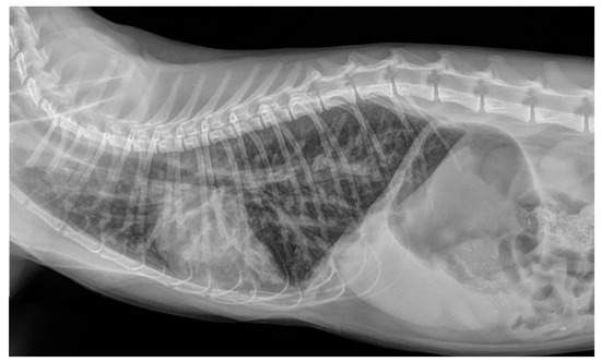 Knowledge on the radiographic features of troglostrogylosis is still poor due to the paucity of clinical studies on this disease. The main finding in cats with monospecific T. brevior infection is a mild to severe bronchial pattern, associated or not with interstitial and/or alveolar patterns (Figure 3) [26,41,47,59]. The presence of a sole unstructured or nodular interstitial pattern has also been reported [47]. Similar to aelurostrongylosis, a marked alveolar pattern can be present in early and/or severe stages of troglostrongylosis, either alone or mixed with an interstitial and bronchial pattern. For instance, this radiological evidence has been described in 35- and 40-day-old kittens [60,61] (Figure 4) and in a 3-month-old kitten with T. brevior monospecific infection [47]. It is interesting to note that thoracic alterations may vary among infected animals belonging to the same litter, which can also present different degrees of clinical signs’ severity [42,61] (Figure 4). As lung damage depends on the number of infectious larvae [50], it is likely that kittens of the same litter acquire a varying number of T. brevior larvae vertically transmitted, which results in differing lung parenchymal lesions. PH in course of troglostrongylosis leads to a right-sided cardiomegaly [41], observable using X-ray imaging (Figure 5).