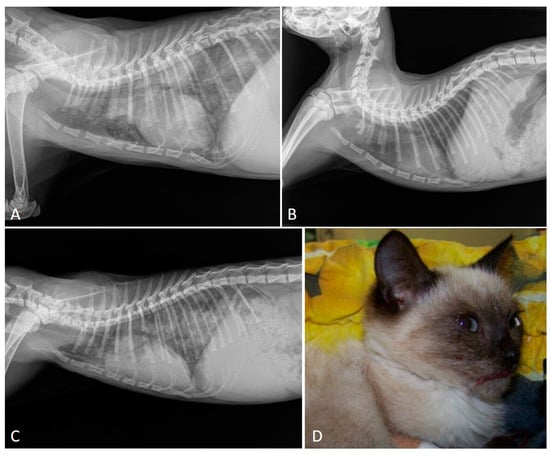 - Mooney, E.T.; Rozanski, E.A.; King, R.G.P.; Sharp, C.R. Spontaneous pneumothorax in 35 cats (2001–2010). J. Feline Med. Surg. 2012, 14, 384–391. [Google Scholar] [CrossRef]