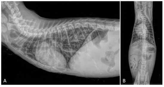 Right lateral (A) and dorsoventral radiographs (B) of a 3-year-old female domestic shorthair cat displaying evidence of a mixed interstitial-alveolar pattern (courtesy of Chiara Sforzato, Ospedale Veterinario h24 “Abruzzo”, Pescara, Italy).