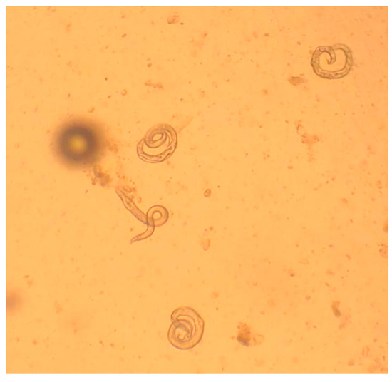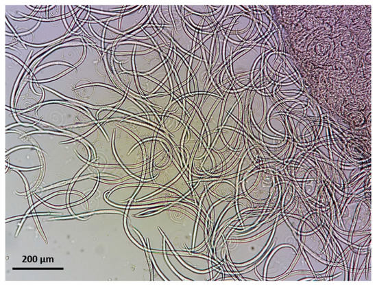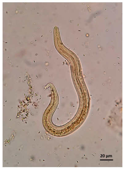 The detection of L1 in feces is feasible by classical parasitological methods such as flotation or sedimentation [69,70], although the gold standard diagnostic technique is Baermann’s test, which presents higher sensitivity and allows detection and identification of L1 [5,69,71]. It should be taken into account that salt solutions may dehydrate the larvae which, in this case, sink, shrink and/or become difficult to identify [11] (Figure 8). Baermann’s test can be conducted with various setting arrangements (Figure 9) depending on either field, clinical or laboratory conditions. With this method, the L1 migrate from feces to the water and can be collected after 12–24 h from the sediment of the liquid in the Baermann’s apparatus. Fresh fecal samples or stored at refrigeration temperatures for a few days are required for the test, so that the larvae remain alive and sufficiently motile. In case of dead larvae (e.g., frozen feces), ZnSO4 flotation is the next best option, as larvae retain their morphological features and can be identified (Figure 10). L1 of T. brevior are more resistant than those of A. abstrusus, being very tolerant to low temperatures and remaining alive and motile even in feces kept frozen for a long time.