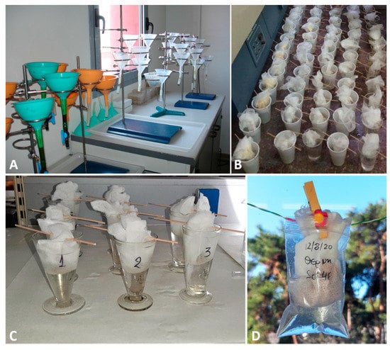 Baermann’s method applied in various conditions. Apparatus settings in a laboratory oriented to lungworm research (A), in a veterinary clinic (B), in a laboratory with basic equipment (C), in the field (D).