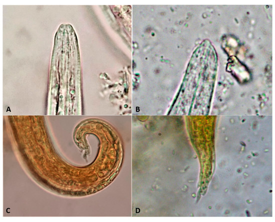 Under the microscope, A. abstrusus and T. brevior L1 may appear similar, though their discrimination is possible based on specific morphometric and morphological characteristics [5,72,73] (Table 1, Figure 11).