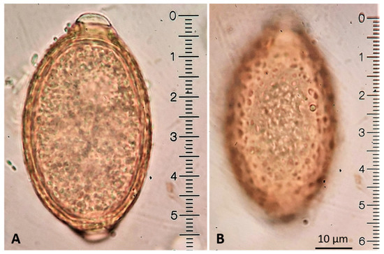 Capillaria aerophila eggs may be found both by flotation and sedimentation methods [69,71]. Due to their characteristic yellowish color, lemon shape, and bipolar appearance, they may be confused with Trichuris eggs. This is a diagnostic problem mainly in canine parasitology because the felid whipworm Trichuris felis [75] is extremely rare or even absent in most areas of the world [4]. Nevertheless, the presence of Trichuris eggs in cat feces, either due to factual whipworm parasitosis or due to pseudoparasitism (e.g., Trichuris muris eggs, in case the cat preyed an infected rodent), should be correctly distinguished from those of C. aerophila. There are specific morphometric and morphological differences between C. aerophila and Trichuris eggs, which are clearly visible under the optical microscope. The egg size allows only the discrimination between C. aerophila (64–66 × 32–40 µm) and canine Trichuris vulpis (72–94 × 31–42 µm) [76]. However, T. felis and T. muris eggs have overlapping sizes with C. aerophila [75,77], thus in this case other morphological characteristics will support the accurate differentiation. The eggs of C. aerophila display a network of anastomosing ridges on the wall surface, asymmetrical polar plugs and absence of a thickening with ringed appearance at the base of the polar plugs (Figure 12). These rings are conversely present in Trichuris spp. eggs, that in addition have a smooth egg wall [76]. Differentiation of C. aerophila from other capillariid ova present in the feces of cats praying infected birds (pseudoparasitism) [11] is achieved mainly by the observation of the characteristic surface of the eggs [78].