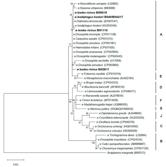 Phylogenetic analysis of Wolbachia 16S rRNA gene sequences (in bold) obtained in this study from Ixodiphagus hookeri eggs and Ixodes ricinus ticks, and published sequences from I. hookeri, other insects and nematodes known to harbour Wolbachia. Anaplasma marginale was used as an outgroup, and Wolbachia supergroups are indicated by upper-case letters to the right of the tree. The maximum likelihood tree was based on 35 partial 16S rRNA gene sequences with a total of 972 positions in the final dataset. The phylogeny was inferred with the Tamura-Nei model, a discrete Gamma-distribution and a proportion of invariable sites (TN93+G+I). The tree is drawn to scale, with branch lengths measured in the number of substitutions per site. Numbers represent bootstrap support generated from 500 iterations. The GenBank accession numbers of the sequences used in these analyses are shown in brackets.