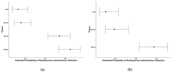 Model-based detection probability estimates (95% confidence interval bars) for Renibacterium salmoninarum; (a) using anal, buccal and mucus swabs, or kidney tissues, and (b) using anal, buccal, or mucus swabs when samples are known to be positive by testing kidney tissues with DFAT.