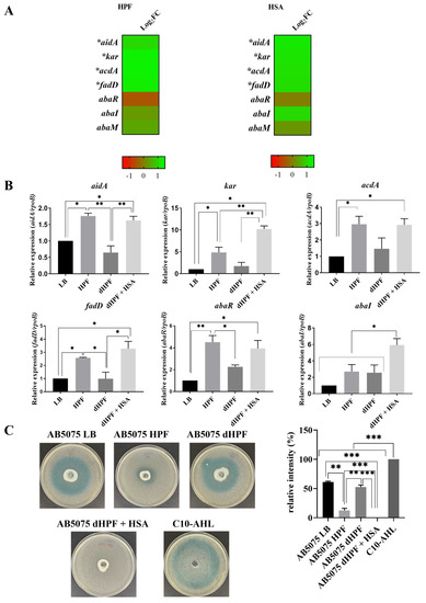Analysis of mRNA extracted from A. baumannii AB5075 cells cultured in the presence or absence of HPF or HSA showed that the expression of four out of seven genes associated with quorum sensing and quorum quenching was significantly enhanced (Table S1 and Figure 1A). The kar, acdA, and fadD genes code for 3-oxoacyl-ACP reductase, Acyl-CoA dehydrogenase, and Acyl CoA synthase, respectively. All three enzymes participate in AHLs synthesis [17]. The aidA gene codes for the quorum quenching α/β hydrolase AidA, which catalyzes the hydrolysis of the auto-inducer that results in inhibition of the motility and biofilm formation in A. baumannii [17].