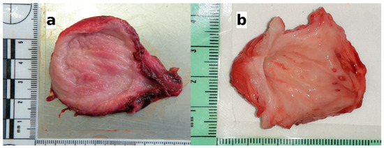 The gross lesions of the urinary bladders observed in the infected animals. (a) Wolf: congested areas of mucosal surface; histologically, moderate eosinophilic cystitis was observed (see Figure 3b); (b) wolf: congested areas in the body of the bladder and raised hemorrhagic nodules in the area around the urethral opening; histologically, hyperplasia of the lymphoid nodules, along with perinodular hemorrhages in the mucosa and severe eosinophilic cystitis were observed (see Figure 3c).