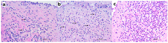 Histologically, mild to severe eosinophilic cystitis was observed in the infected animals. (a) Red fox: mild eosinophilic cystitis; scattered eosinophils (arrows) in the mucosal lamina propria along with lymphocytes and plasma cells; hematoxylin and eosin (HE); (b) wolf: moderate eosinophilic cystitis; eosinophils (arrows) arranged in small aggregates in the lamina propria; HE; (c) wolf: severe eosinophilic cystitis; numerous eosinophils infiltrating the mucosal lamina propria; HE.