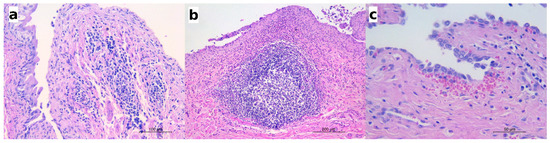 In five infected wolves affected by moderate or severe eosinophilic cystitis, hyperplasia of the lymphoid nodules in the mucosa was also observed (Figure 4b), along with perinodular hemorrhages (as seen in the urinary bladder in Figure 2b), hyperaemia, and scattered microhemorrhages in the lamina propria (Figure 4c). Lymphoid nodule hyperplasia was not described in any species other than the wolf or in cases of only mild cystitis.