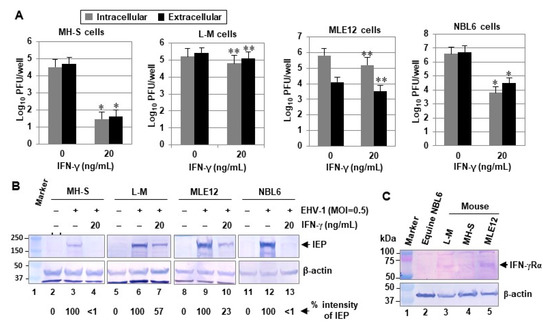 IFN-γ treatment reduces EHV-1 yields in a cell line-dependent manner. (A) Murine alveolar macrophage MH-S, mouse fibroblast L-M, mouse lung epithelial MLE12, and equine dermis NBL6 cells plated in 12-well plates (3 × 105 cells/well; 5 × 105 cells/well for MH-S cells) were treated with 20 ng/mL (1 mL/well) of murine IFN-γ or (equine IFN-γ for NBL6 cells), and the cells were infected with 0.5 MOI of EHV-1 KyA at 24 h post-treatment. At 30 hpi, intracellular virus was released (see in Materials and Methods) and titered by plaque assay on NBL6. (B) The infected cells were also harvested at 30 hpi for Western blot analyses using anti-IEP OC33 [29] and anti-actin (Santa Cruz Biotechnology, Santa Cruz, CA, USA). Data are representative of three independent experiments. Numbers to the left represent molecular weight standards (kDa) (Bio-Rad Laboratories, Hercules, CA, USA). Quantification was done with Image Studio Lite software (LI-COR Biosciences, Lincoln, NE, USA). *, p < 0.01 for comparison with the untreated control. **, p < 0.05 for comparison with the untreated control. A two-tailed t-test was performed. (C) Detection of IFN-γ receptor in three mouse cells (MH-S, L-M, and MLE12). Cell extracts were used for Western blot analyses with the anti-mouse IFN-γRα monoclonal antibody (Santa Cruz Biotechnology) and anti-β-actin polyclonal antibody.