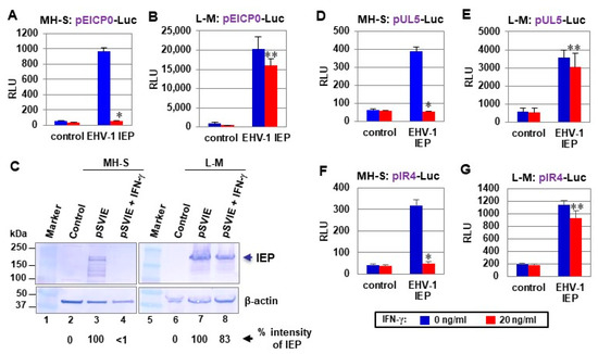 Interestingly, IFN-γ was not able to reduce the levels of IEP expression at 6 hpi [21], indicating that IFN-γ may inhibit viral gene expression after the immediate-early (IE) stage of infection. EHV-1 IEP is a major viral trans-activator and is essential for viral growth [27,30,31]. EHV-1 gene transcription occurs in a cascade that leads to the synthesis of viral proteins that are classified as IE, E, and L [32,33,34,35]. Based on these results, we hypothesized that IFN-γ blocks viral E and L gene expression by inhibiting IEP function. To address this possibility, we performed luciferase reporter assays with EHV-1 promoter reporter plasmids.
