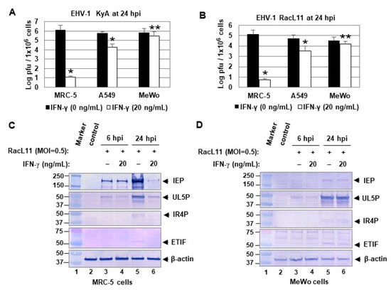 IFN-γ inhibits EHV-1 replication in human lung fibroblast MRC-5 cells. MRC-5, A549, and MeWo cells were treated with 0 or 20 ng/mL (1 mL/well) of human IFN-γ, and infected with 0.02 MOI of EHV-1 KyA (A) or RacL11 (B) at 24 h post-treatment. Intracellular virus titers were determined at 24 hpi by plaque assay. Data are the averages of three independent experiments. Error bars indicated standard deviation. *, p < 0.01 for comparison with the controls. **, p < 0.05 for comparison with the control. The MRC-5 (C) and MeWo (D) cells were treated with 0 or 20 ng/mL of human IFN-γ and infected with EHV-1 RacL11 (MOI = 0.5) at 24 h post-treatment. The infected cells were harvested at 6 or 24 hpi and used for Western blot analyses using the anti-IEP polyclonal antibody (pAb) OC33, anti-UL5P, anti-IR4P, anti-ETIF, and anti-β-actin.