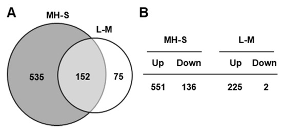 Murine alveolar macrophage MH-S gene expression is altered by 8 h of IFN-γ treatment. (A) Venn diagram represents the statistically significant individual and shared genes altered by IFN-γ in MH-S and L-M cells. MH-S and L-M cells were treated with 20 ng/mL (1 mL/well) of murine IFN-γ. The untreated and treated cells were harvested at 8 h post-treatment and used in DNA microarray analyses using the Affymetrix mouse Genome 430 2.0 array (Affymetrix, Santa Clara, CA). (B) The number of changed genes in IFN-γ-treated MH-S and IFN-γ-treated L-M cells. The numbers indicate the genes from the total microarray datasets that showed a greater than 2.0-fold increase or more than a 2.0-fold reduction (p-value ≤ 0.05). Up, upregulated genes; down, downregulated genes.