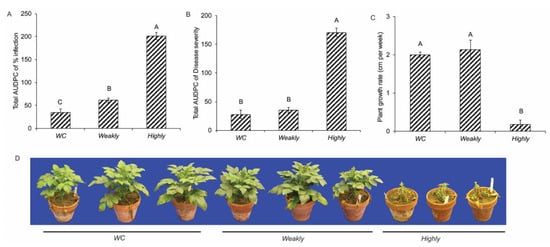 The highly aggressive isolate (Vd1396-9) induced significantly more disease measured as total AUDPC of “percentage of infection” and “disease severity” than the weakly aggressive isolate (Vs06-07) or water control (Figure 1A,B). The plant growth rate of potato inoculated with Vd1396-9 was significantly lower than that of the other two treatments (Figure 1C). Potato plants inoculated with Vd1396-9 exhibited more symptoms at 5 weeks after inoculation (WAI) than plants inoculated with Vs06-07 or water (Figure 1D). The percentage of infection of plants inoculated with the weakly aggressive isolate was only slightly higher than in the water control, but significantly lower than with the highly aggressive one (Figure 2A). The plants inoculated with the weakly aggressive isolate showed similar disease severity and plant growth rates as water controls (Figure 2B–D).