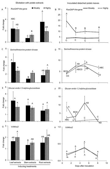 Expression of genes involved in cell differential and proliferation under different treatments. Expression of (A) Ras-GAP like protein, (C) serine/threonine protein kinases, (E) glucan endo-1,3-alpha-glucosidase and (G) VdWos2 in the highly (Vd1396-9) and the weakly (Vs06-07) aggressive V. dahliae isolates in response to elicitation with different potato extracts: leaf, stem, root extracts. Expression of (B) Ras-GAP like protein, (D) serine/threonine protein kinases, (F) glucan endo-1,3-alpha-glucosidase and (H) VdWos2 in the highly (Vd1396-9) and the weakly (Vs06-07) aggressive V. dahliae isolates in response to infection of detached potato leaves at 1, 3, 5, and 8 DAI. WC: Water control treatment; Weakly: weakly aggressive V. dahliae isolate Vs06-07; Highly: highly aggressive V. dahliae isolate Vd1396-9; ND: Non-detectable. Error bars refer to standard error. The macro PDMIX800.sas [53], α = 0.05 was applied to mean values separated by least squared means, and into grouped letters’ results. Values (n = 3) with the same letters are not significantly different (p < 0.05).